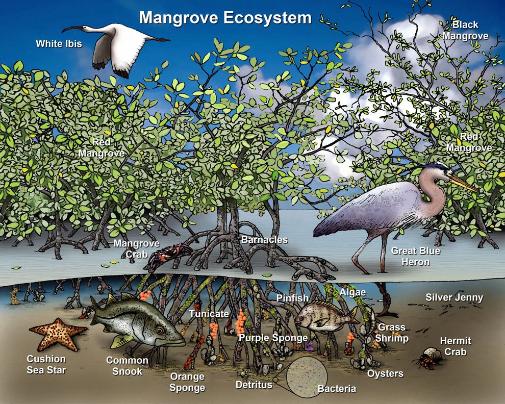 Mangroves do an excellent job of preventing erosion from incoming waves and outgoing rivers and streams. They’ll create a build-up of soil and sediment that may even eventually turn them into an island. This creates calmer waters allowing for their leaves and branches to fall into the water and decay into organic material. This organic material is essential for small microorganisms such as algae to survive which then feeds small organisms such as worms, anemones, shrimp, and so on.