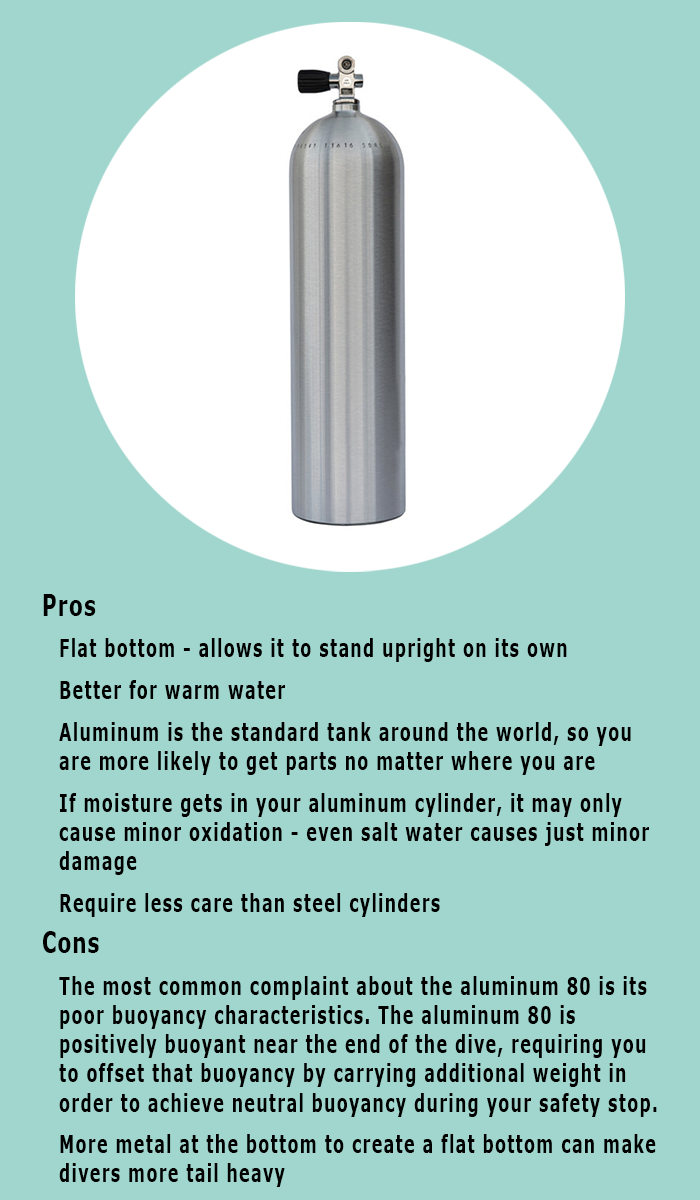 Scuba tanks are built in all shapes and sizes. They can be tall and skinny, short and stubby, and flat or round bottomed. Aluminum tanks are flat bottomed and are manufactured to hold anywhere from up to 100 cubic feet of air. Steel tanks are round bottomed and manufactured to hold up to 133 cubic feet of air. However, just because they hold more air, does not mean certain steel tanks are larger or wider than others. Steel tanks have many varying sizes to help cater to every diver. For many women, and shorter individuals, there are shorter tanks that are a bit wider. These tanks help prevent you from bumping your head or butt on the tank while you dive.