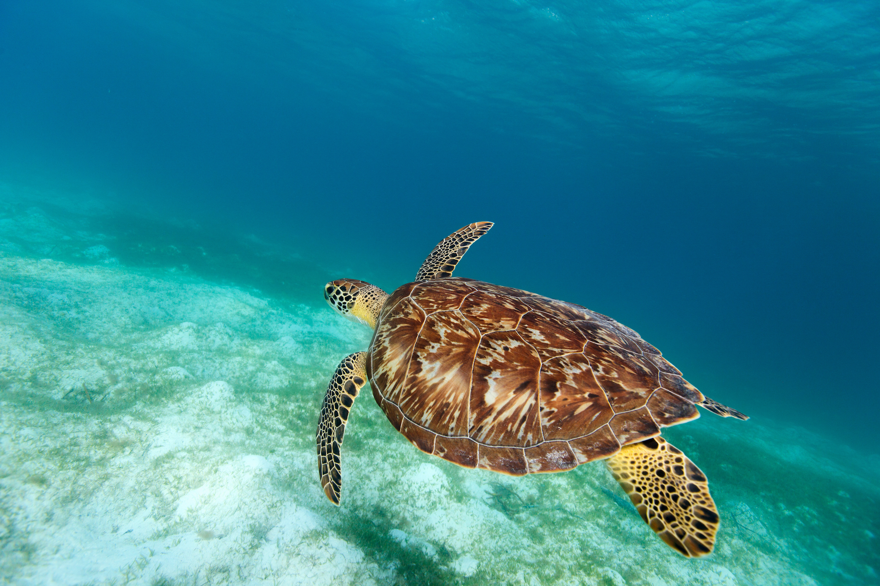Green Turtle - As one of the world's largest turtle species, Green Turtles grow up to 4ft long and weigh an average of 350 lbs! Named after the layer of green fat under their shell, Green Sea Turtles are primarily vegetarian. Juveniles will eat small crustaceans and worms, but once adults, they primarily feed on algae and sea grass. Green Turtles are among the faster species of turtle reaching speeds of up to 21 mph but typically cruising around 2 mph. Divers can see Green Turtles pretty often since they typically reside in shallower waters on coral reefs. When diving at the same spots, it can be common to see the same turtles at the same time every year. This is because Green Sea Turtles will migrate thousands of miles to breed along the same beaches they were born.