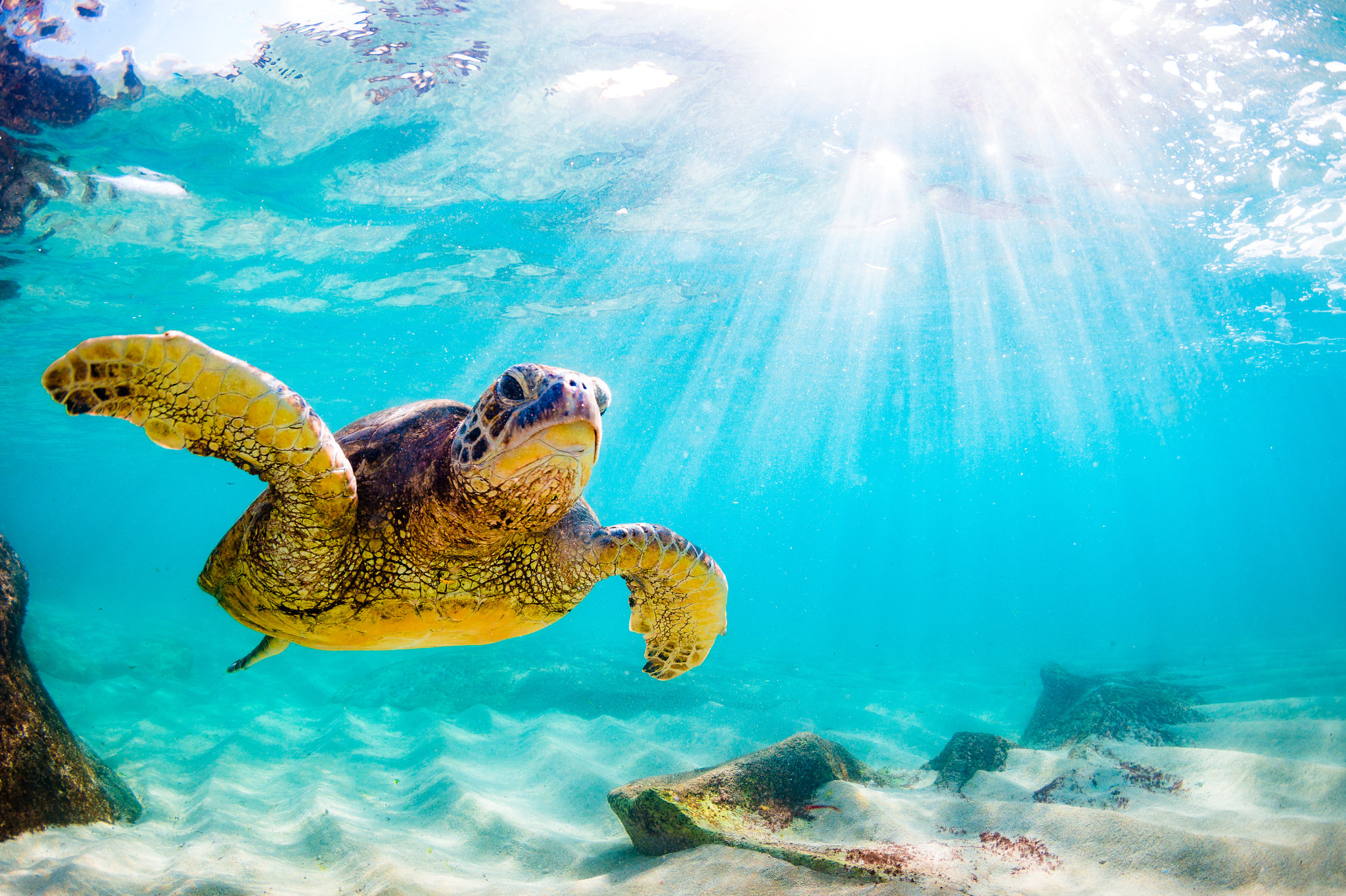 Turtles can come in many different shapes and sizes. The Speckled Cape Tortoise is the smallest turtle that grows to 3.1 inches and weighs only 5 ounces. While the leatherback sea turtle is the largest sea turtle growing to over 5 feet and weighing up to 1,500 lbs! Diving with these turtles can be quite wondrous! They move slowly and calmly in the ocean allowing for some excellent photo-ops. However, it is important to always approach turtles from the side, and to never swim above a turtle. When swimming up to a turtle, do so slowly and calmly. Avoid touching the turtle or making any sudden movements. If the turtle begins to swim towards you, just remain still, or slowly move out of its way.