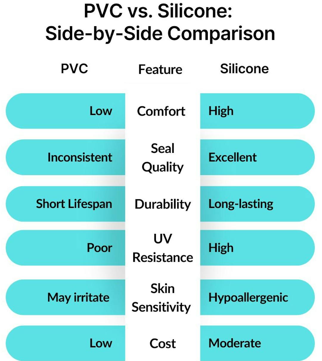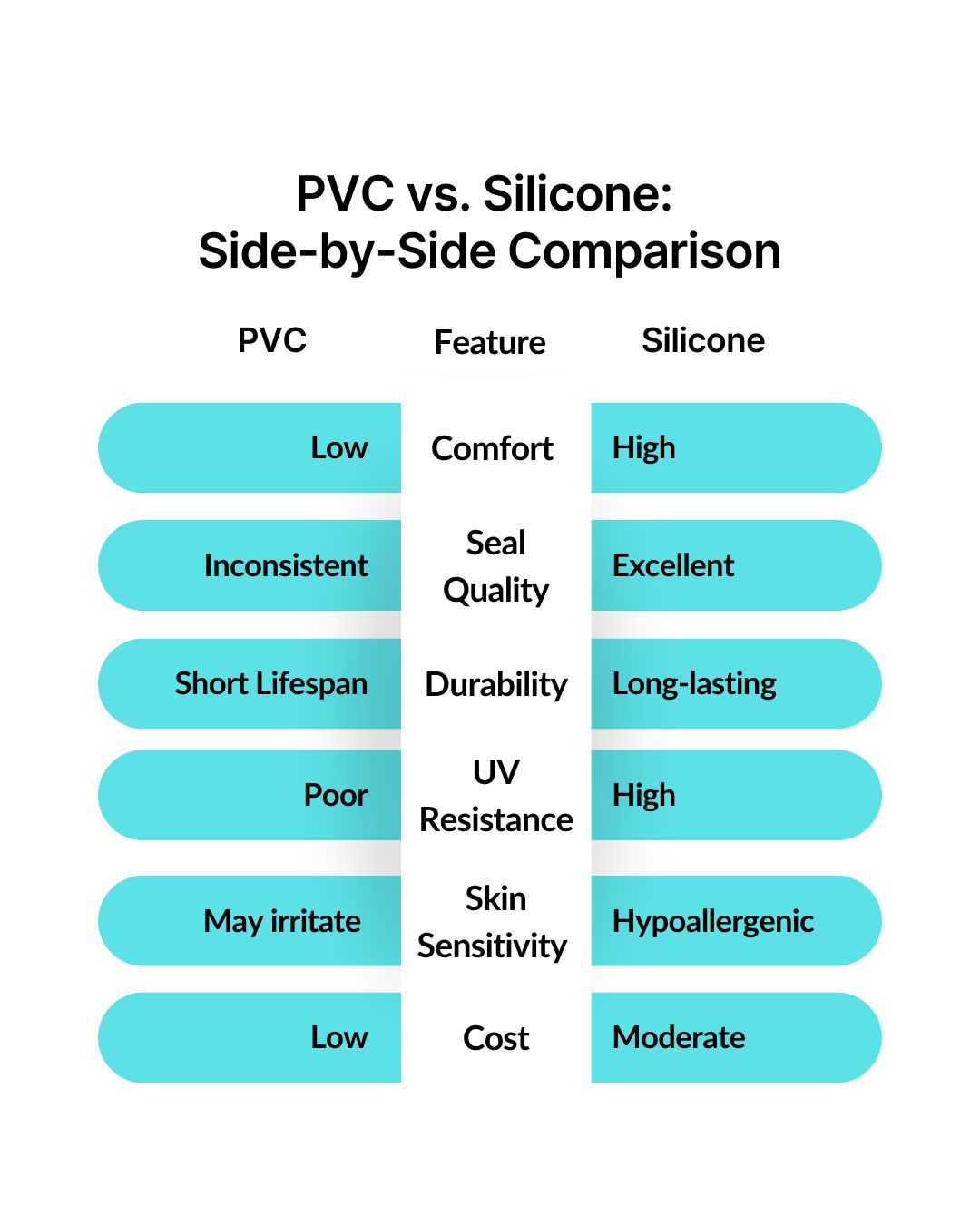PVC is a type of plastic commonly used in low-cost snorkels and dive masks. It’s rigid compared to silicone and can feel stiffer against the skin.