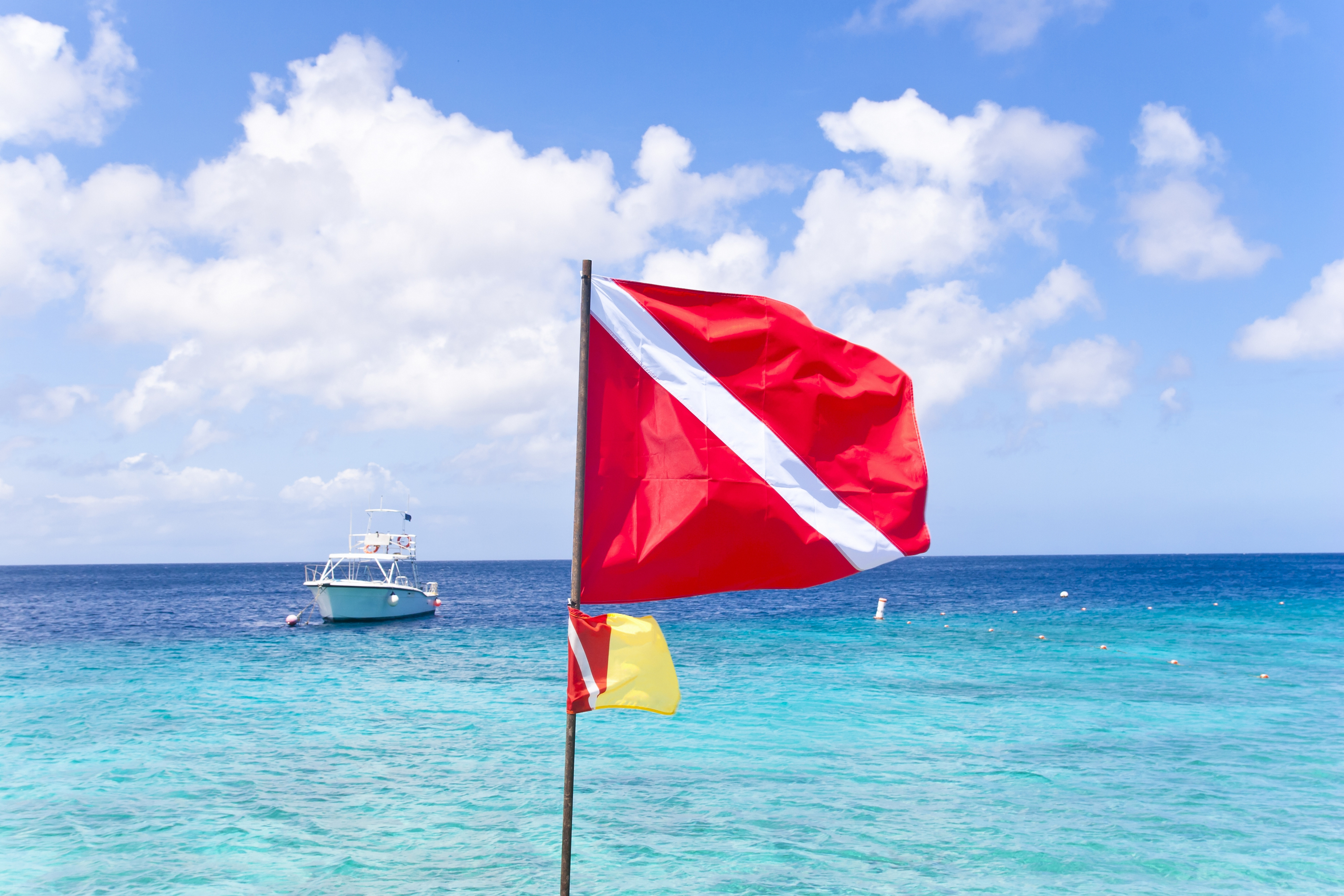 First and foremost, let’s talk about dive flags. Dive flags are an important safety device used by divers all over the world, letting boaters and other water-goers know where there are divers in the water. It's a red flag with a diagonal white stripe across. In some locations, it is required by law to have a dive flag when diving, but regardless of the law, it is always a safety essential for any diver anywhere.