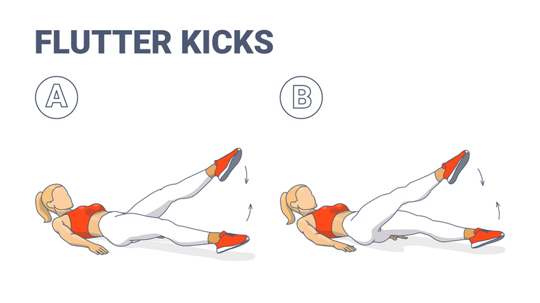 Lie on your back and bring the palms of your hands to the floor next to your hips. For more support, you can wiggle your hands under your hips slightly. Lift your legs to a hover over the ground (not too high) and, if accessible for the neck, lift your head and shoulders from the floor keeping your neck long and face relaxed. Then you’ll alternate between lifting one leg slightly higher than the other, almost like you’re kicking your fins in the water. Try to keep pressing your belly into your spine and your low back into the floor. Remember to breathe!
