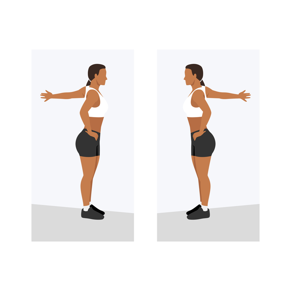 To practice squats, bring your feet slightly wider than hip distance. If having your feet facing forward is uncomfortable for the knees, the feet can turn slightly out. Extend your arms forward, palms facing down, and bend your knees until your thighs are parallel to the floor. Inhale and stand back up. Repeat anywhere from 20-30 times per set.