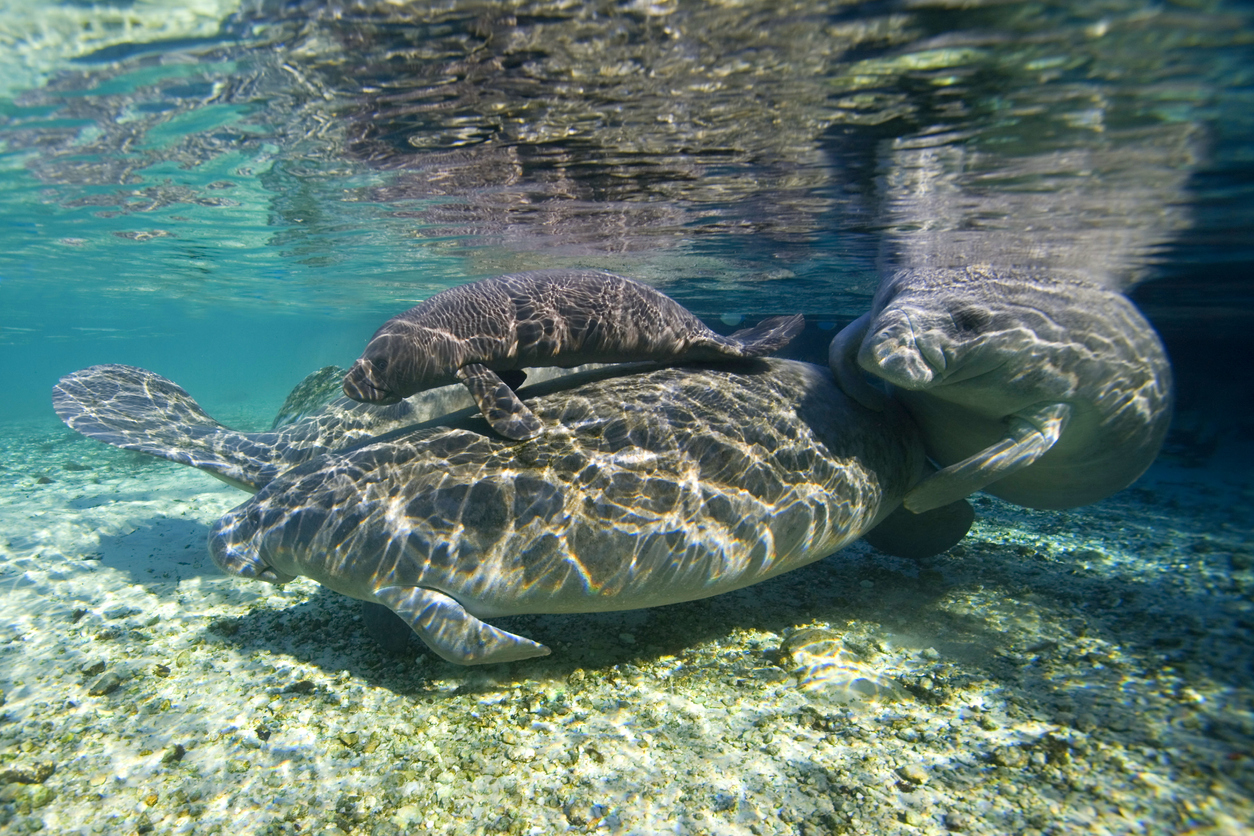 Reaching adulthood at about five years of age, the Manatee reproductive cycle is a bit long. Gestation lasts about a year and usually results in a single birth, twins are rare. Each female averages giving birth about every two to five years with the calf being dependent on mom for the first two years. The milk she produces is essential to the baby’s growth and development.