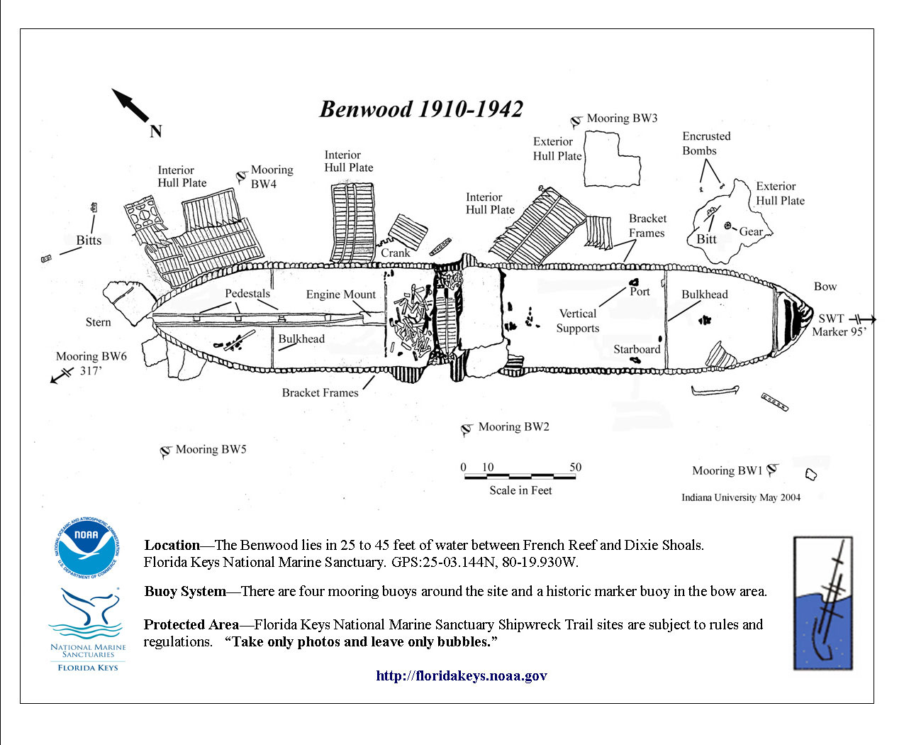 There are no markers for this wreck, just 2 mooring buoys in 25 ft of water at the stern and the bow. The observation deck reaches 75 ft deep, so this dive should only be done by advanced certified divers. Strong currents are common at this dive site, so be wary of your oxygen consumption and plan your dive accordingly. There's no question as to why this is Marathon’s most popular wreck. With so much to see, and big fish to shoot, it's the perfect dive site for the avid diver and spearo.