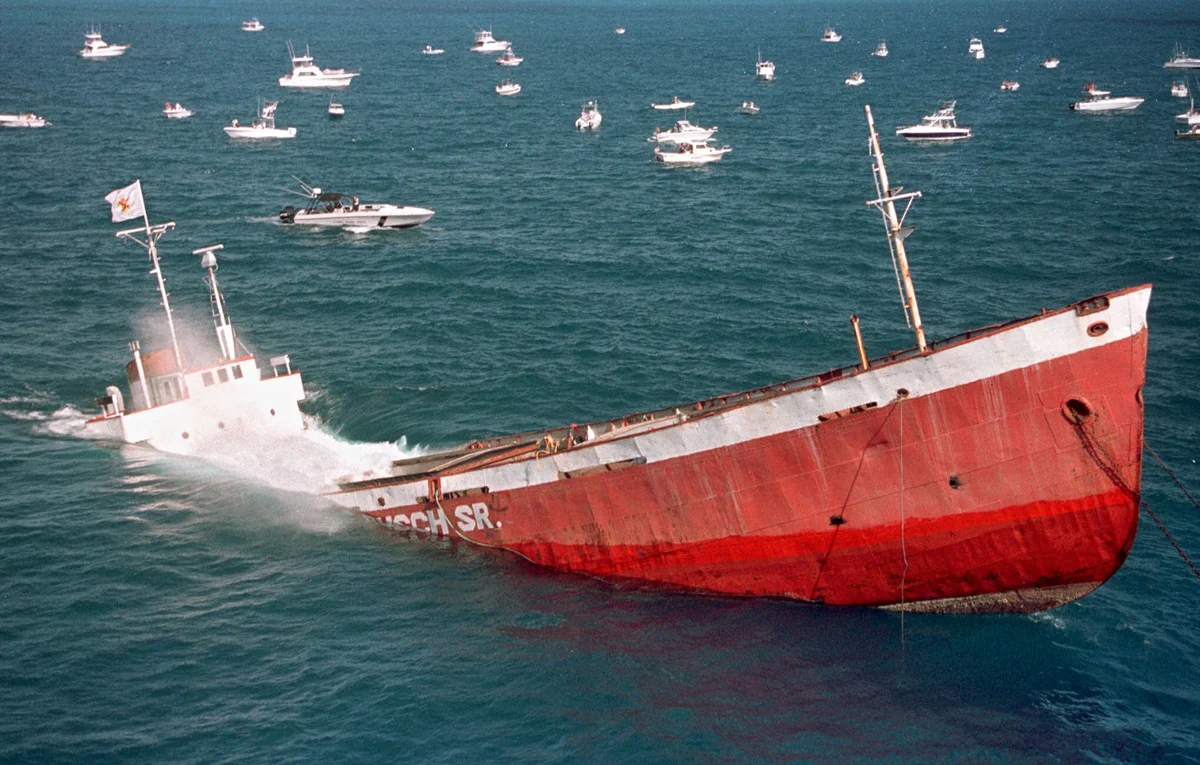 Finishing off our list is a wreck with a story. The Cayman Salvager is a 187 ft steel-hulled wreck that was used as a lighthouse buoy tender. From 1936 to 1979, it was used as a cable layer and freight hauler known as Cayman Salvor. But what really makes this wreck unique is that in 1979, the United States government seized the ship carrying 1,400 Cuban refugees during the Mariel boatlift. After seizure, the ship sat neglected in a Navy Harbor in Key West for 5 years where she actually sank in 1985. She was then refloated and it was finally decided to scuttle the ship to become a deep reef in 300 ft of water. While towing the ship to its final location, the cable snapped, and sent the Cayman Salvager down in 92 feet of water to rest on its side 7 miles southeast of Key West. This was excellent for recreational divers, because it gave them a chance to dive it. If it was sunk at 300 ft, only a select few divers would be able to explore this historical wreck.